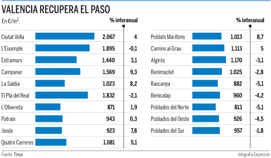 Район, где произошло наиболее сильное годовое увеличение стоимости жилья в Валенсии, это Campanar (+9,3%), который уступает по положительной динамике цен в Испании только районам Les Corts (Барселона) и Salamanca (Мадрид).