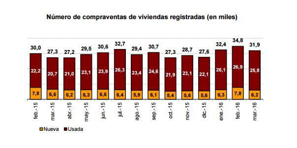 На рынок вторичного жилья пришлось 80,7% от общего числа сделок купли-продажи марта 2016 года, где было продано 25.765 объектов. Годовой рост этого сегмента составил 24,2%. С другой стороны, продажи новостроек снизились на 6,6% (г/г) до 6.160 операций.