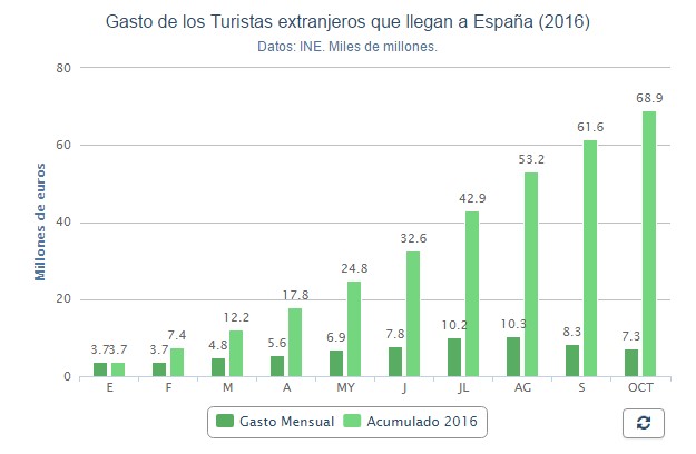 В течение первых десяти месяцев 2016 года 67,483 миллиона иностранных туристов, посетивших Испанию, заплатили в магазинах, сувенирных лавках, отелях, ресторанах и досуговых центрах 68,929 млрд. евро, что на 8,4% больше, чем в том же периоде прошлого года. Такие данные были опубликованы сегодня Национальным институтом статистики по результатам обследования туристического расходов (EGATUR).