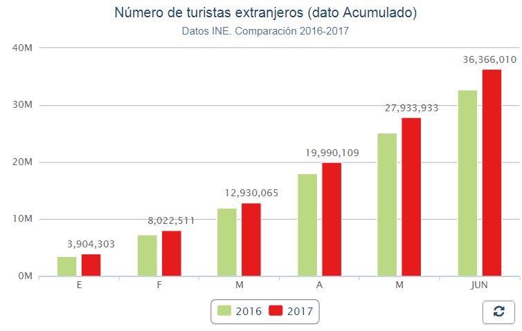 В течение первой половины 2017 года в Испании побывало 36.366.010 иностранных туристов, и это на 11,6% больше, чем за тот же период прошлого года. Такие данные привёл сегодня Национальный Институт статистики (INE), в соответствии с обследования туристских перемещений в границах (Frontur).