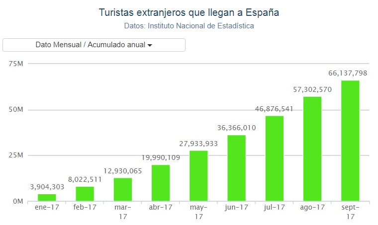 В течение первых девяти месяцев 2017 года в Испании побывало 66,138 млн. иностранных туристов, и это на 10,1% больше, чем за тот же период прошлого года. Такие данные привёл сегодня Национальный Институт статистики (INE), в соответствии с обследования туристских перемещений в границах (Frontur). Показательно, что за весь 2014 год Испанию посетило около 65 миллионов зарубежных гостей. В 2015 году их было 68,1 млн., а в 2016 году - 75,6 млн.