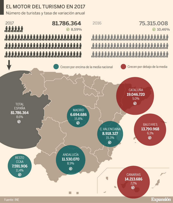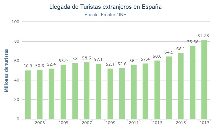 Туристическая отрасль Испании в 2017 году в очередной раз показала рекордные результаты. За минувший год страну посетили 81.786.364 иностранных туристов, и это на 8,6% больше, чем за 2016 год. Такие данные привёл сегодня Национальный Институт статистики (INE), в соответствии с обследования туристских перемещений в границах (Frontur).