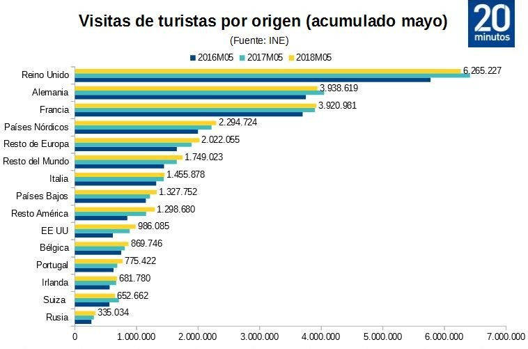 Почти пятая часть от общего числа туристов посетивших Испанию за период январь – май текущего года оказались гражданами Великобритании – их доля в потоке гостей пиренейского королевства составила 21,9% или 6.265.227 человек, что на 2,3 % меньше, чем год назад. В пятёрке стран-лидеров находятся, также, Германия (3.938.619 человек, -2,7%), Франция (3.920.981 человек, +0,6%), Скандинавские страны – суммарно Дания, Финляндия, Норвегия и Швеция - (2.294.724, +3,4%) и Италия (1.455.878 человек, +0,9%).