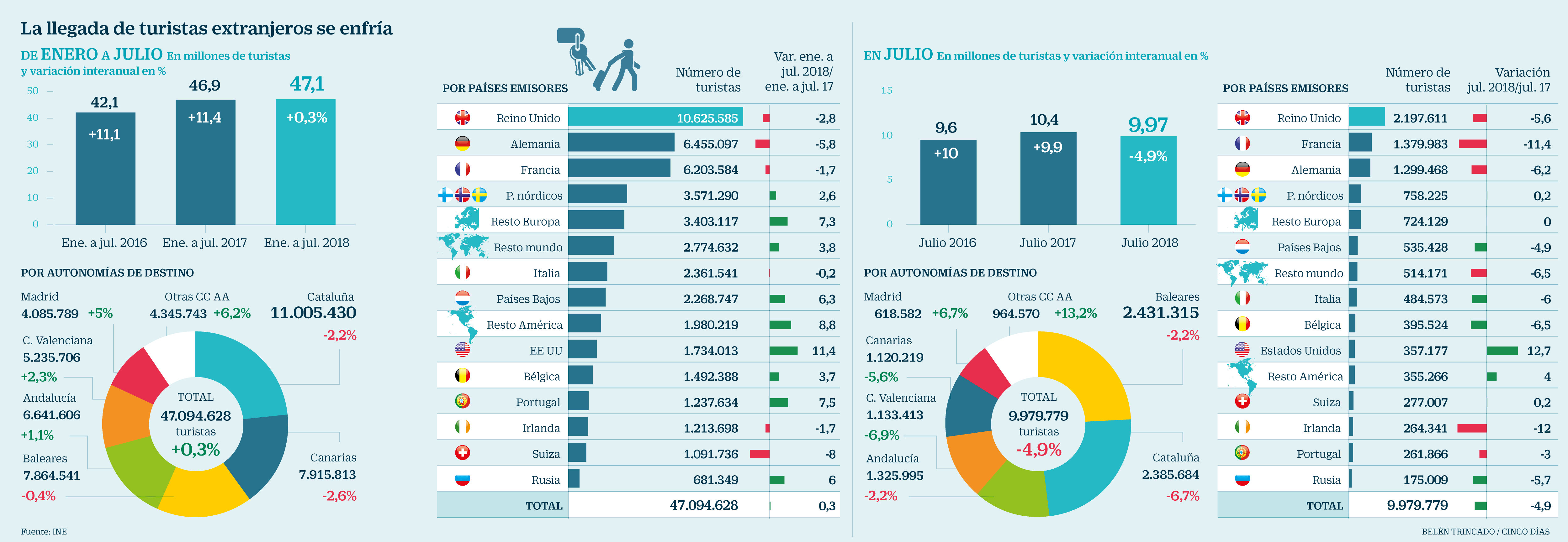 А всего, в течение семи первых месяцев 2018 года в Испании побывало 47.094.628 иностранных туристов, и это на 0,3% больше, чем за тот же период прошлого года. Такие данные привёл сегодня Национальный Институт статистики (INE), в соответствии с обследования туристских перемещений в границах (Frontur).
