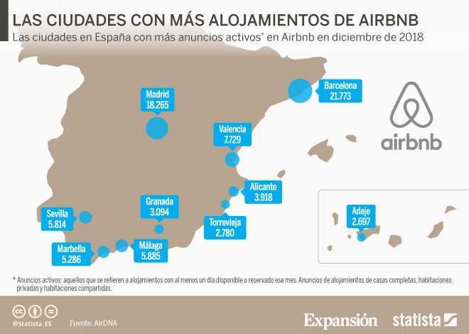 Обращает на себя внимание преобладание жилых объектов, предлагаемых Airbnb для аренды, в городах, расположенных на побережье Средиземного моря: Барселона (1-я в списке), Валенсия (3-я), Аликанте (7). Торревьеха (9), Малага (4) и Марбелья (6), всего более 52 600 объектов.