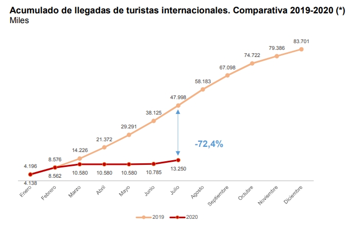 В течение первых семи месяцев 2020 года в Испании побывало 13.249.637 иностранных туристов, и это на 72,4% меньше, чем за тот же период прошлого года (почти 48 млн.). Такие данные привёл сегодня Национальный Институт статистики (INE), в соответствии с обследования туристских перемещений в границах (Frontur).