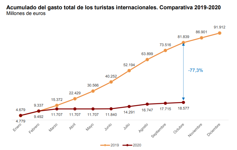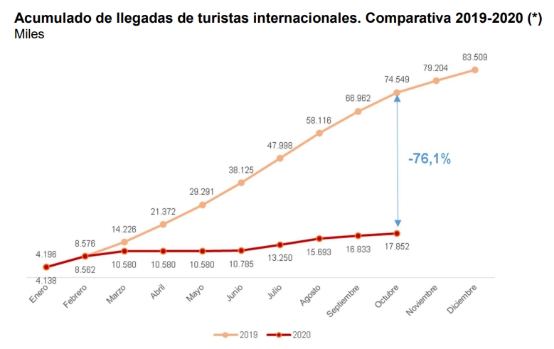 Десять месяцев спустя кризис, связанный с коронавирусом поразил отрасль, на долю которой приходится 12% ВВП и занятости в Испании. В период с января по октябрь 2020 года страну посетило только 17,9 миллиона иностранных путешественников, что на 76,1% меньше, чем за тот же период 2019 года (74,55 млн.). Таким образом, цифры текущего года возвращают туристический рынок Испании к уровню 1990 года.