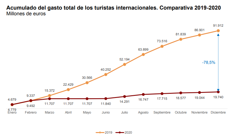 Снижение числа зарубежных туристов привело падению их платежей в магазинах, сувенирных лавках, отелях, ресторанах и досуговых центрах, которые составили в 2020 году 19,740 млрд. евро, что на 78,5% меньше, чем в 2019 году (91,912 млрд. евро). Такие данные были опубликованы сегодня Национальным институтом статистики по результатам обследования туристического расходов (EGATUR).