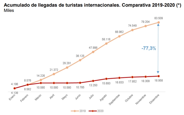 За минувший год страну посетили 18.957.856 иностранных туристов, и это на 73,3% меньше, чем за 2019 год. Такие данные привёл сегодня Национальный Институт статистики (INE), в соответствии с обследования туристских перемещений в границах (Frontur).