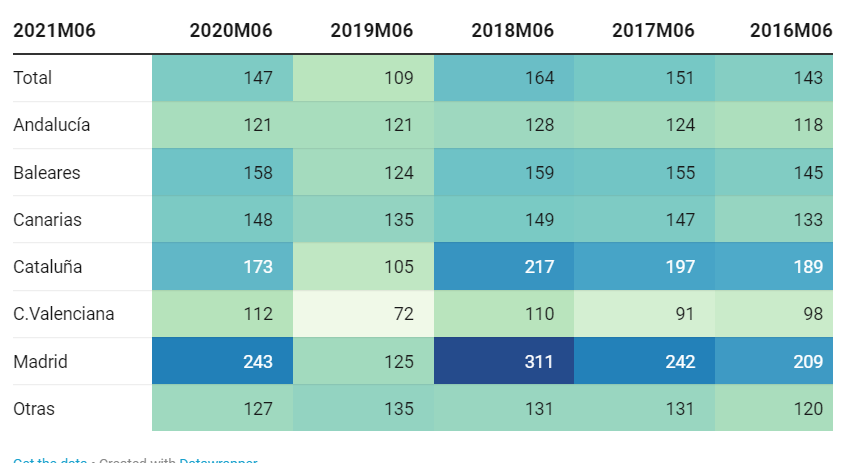 Если сравнить июнь 2021 года с тем же месяцем 2019 года, в период до пандемии, только Валенсийское сообщество имеет положительный баланс, с ростом на 1,8%, а Балеарские и Канарские острова очень близки к данным двухлетней давности (+0,6%).