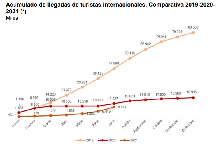 В течение первых семи месяцев 2021 года в Испании побывало 9.814.126 иностранных туриста, и это на 3,41 млн. меньше, чем за тот же период прошлого года и на 38,2 млн. меньше, чем за период январь-июль 2019 года. Такие данные привёл сегодня Национальный Институт статистики (INE), в соответствии с обследования туристских перемещений в границах (Frontur).