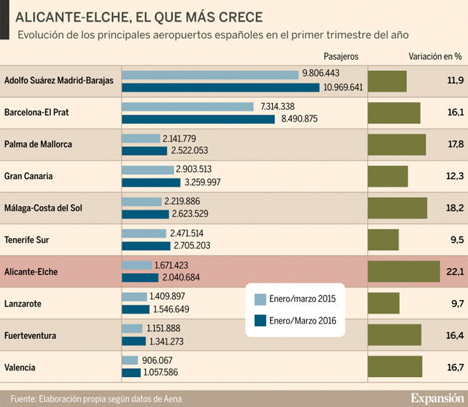 Самую лучшую динамику показал аэропорт Аликанте-Эльче, где за первые три месяца текущего года было зарегистрировано более 2 миллионов пассажиров, что на 22,1% больше, чем в первом й квартал 2015 года.