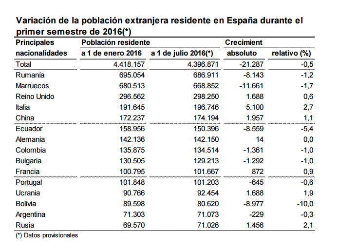 Количество иностранцев – резидентов, проживающих в Испании, сократилось на 0,5%, достигнув величины 4.396.871 человек, в основном за счет приобретения зарубежными гражданами испанской национальности.