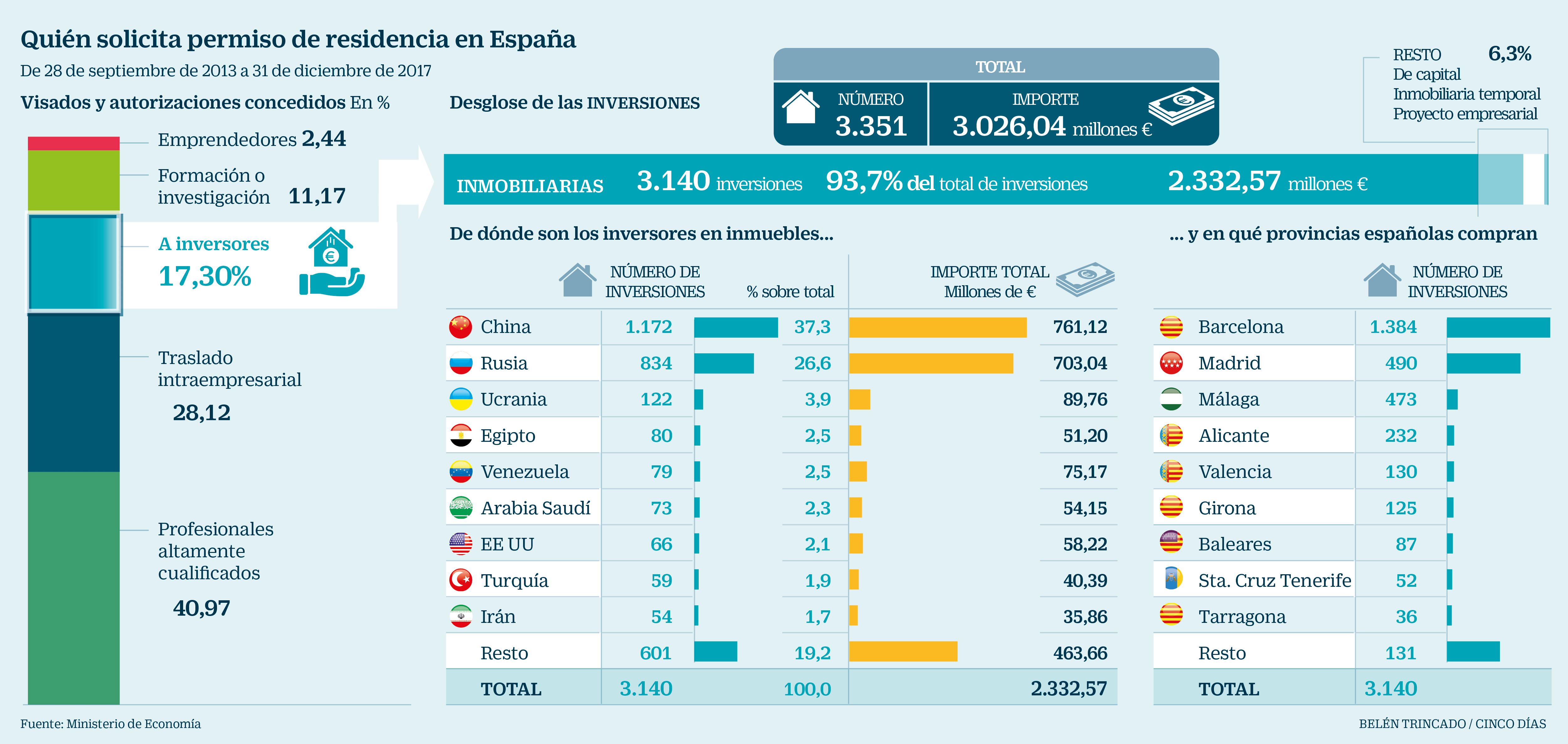 По состоянию на 31.12.2017 года объем средств, вложенных в приобретение недвижимости в Испании, для получения, так называемого ВНЖ инвестора или так называемой "золотой визы", достиг €2,333 млрд., согласно данным Министерства экономики.