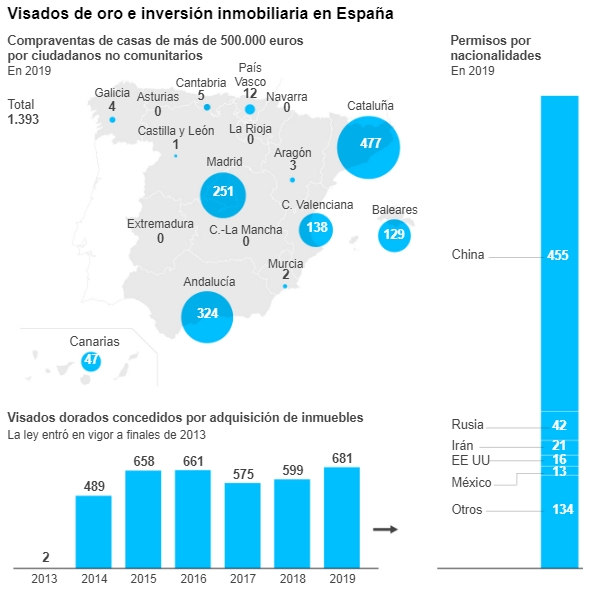 Согласно данным Коллегии регистраторов недвижимости, в прошлом году иностранцы купили в Испании 3.858 объектов жилья, каждый из которых стоил более полумиллиона евро. Из них 1393 операций совершали покупатели из стран, не входящих в ЕС. Среди последних безусловное лидерство принадлежит гражданам Китая и России. Без учета своих родственников среди первых насчитывается 455 инвестора, тогда как число россиян из этой категории составило 42 человека. Далее следуют граждане Иран (21), США (16), Мексика (13), Саудовская Аравия (11), Египет и Филиппины (по 10).
