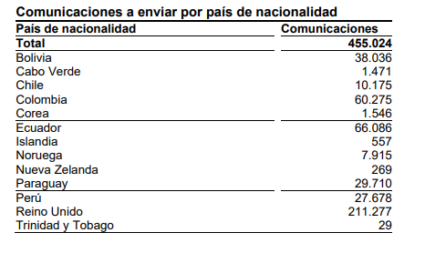 Наибольшее число иностранных граждан, имеющих право голоса, представляют Соединенное Королевство (211.277), Эквадор (66.086) и Колумбию (60.275).