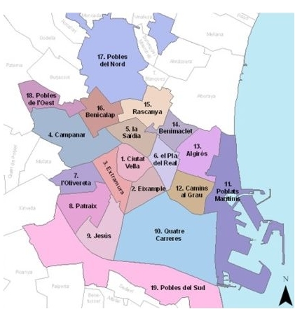 Территориально город Валенсия делится на 19 административных округов (distritos), которые, в свою очередь, разделены на 87 районов (barrios) от 2-х до 7-ми районов в каждом.