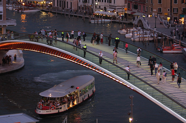 Одновременно в январе стало известно, что на Калатраву собирается подать в суд Венеция — за его мост Конституции. Четвертый мост через Большой канал был задуман в 1999 году. Власти города захотели, чтобы он соединял железнодорожный вокзал Санта-Лючия с пьяццале Рома, площадью с автовокзалом, через которую в город въезжают машины. Таким образом, мост должен был обозначить своеобразные ворота в город. Калатрава спроектировал футуристический и помпезный 95-метровый мост из стекла и камня и подсветил его флуоресцентными лампами. Мост, по задумке архитектора, сначала был полностью собран, а затем установлен.