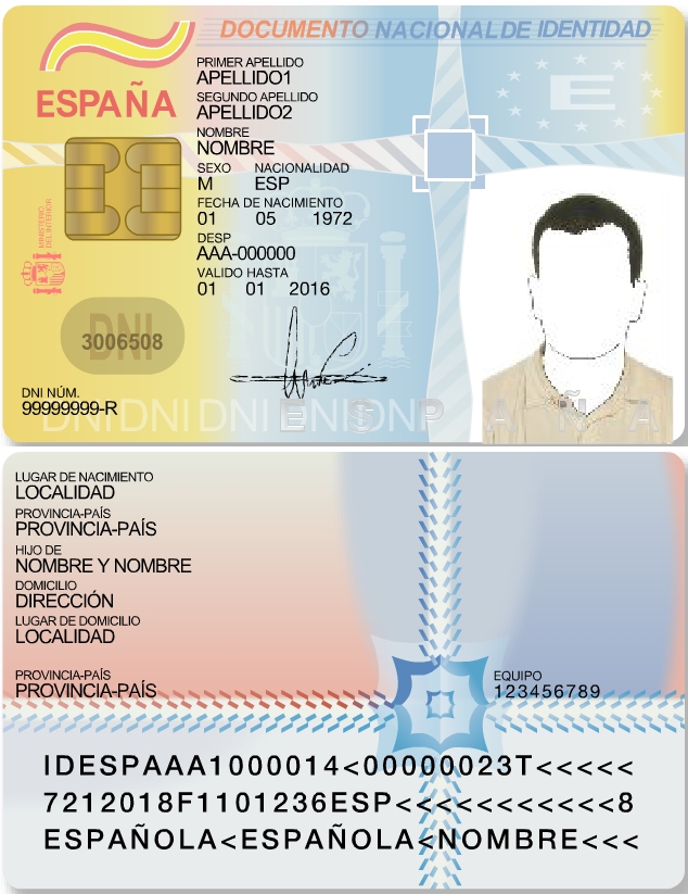 Дизайн для первого DNI был разработан Aкилинo Риуссет Планчоном (Aquilino Riusset Planchón), который выиграл публичный конкурс и получил вознаграждение в 30 000 песет. Согласно требованиям конкурса, карта должна была вмещаться в бумажник, помимо текста, иметь место для отпечатка пальца и фотографии владельца, а краска не должна была выцветать.